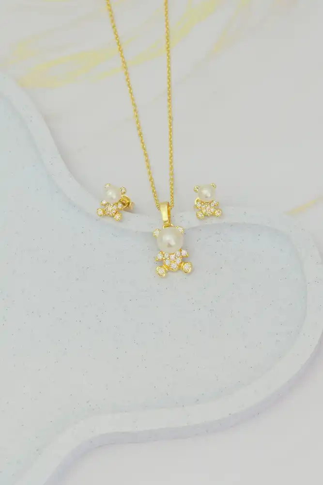 JUEGO DE CADENA, DIJE Y TOPOS EN RODIO DORADO.